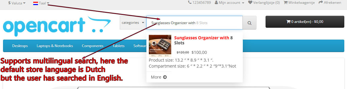 Automatically detects the language of the user's search query and switches the store's language accordingly if a matching product is found. This ensures accurate search results across multiple languages.