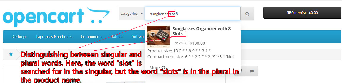 Intelligently detects singular and plural forms of words. For example, if a user searches for "Sunglasses Case," the module will also show results for "Sunglass Case."