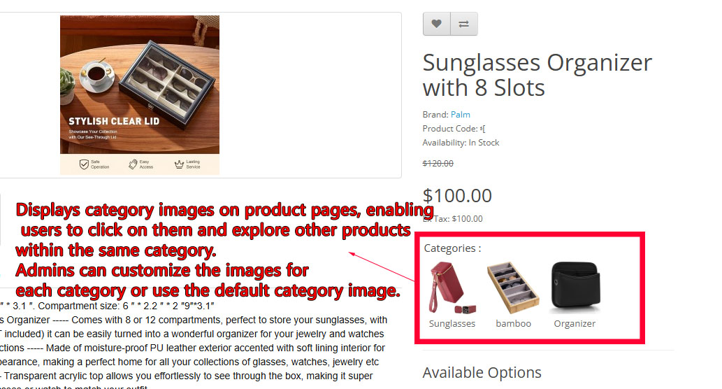 Displays category images on product pages, enabling users to click on them and explore other products within the same category.