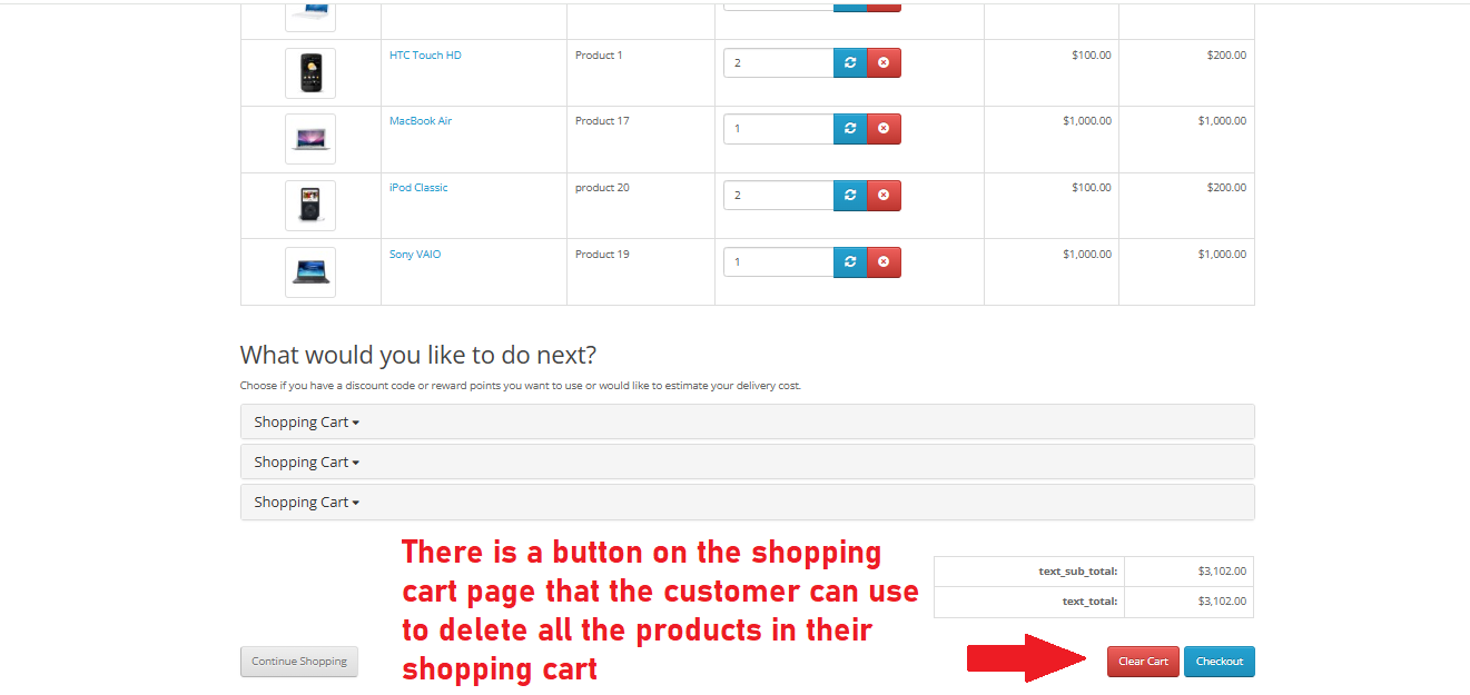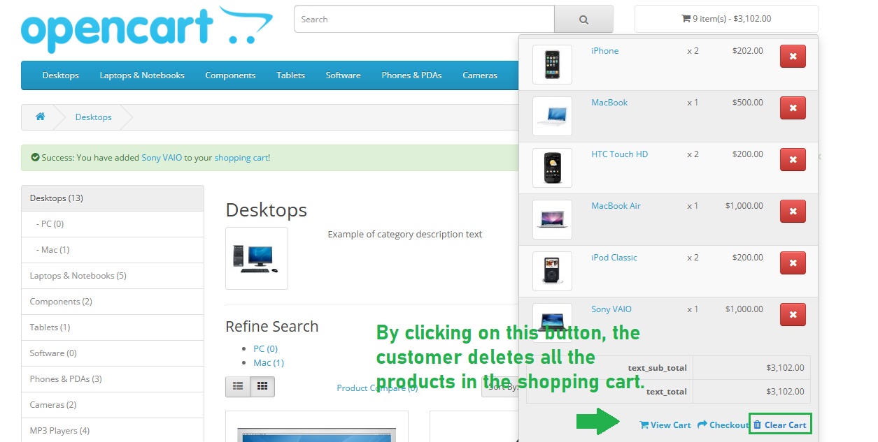 The "Delete cart products" module for OpenCart enhances the shopping experience by introducing a straightforward "Clear Cart" button.