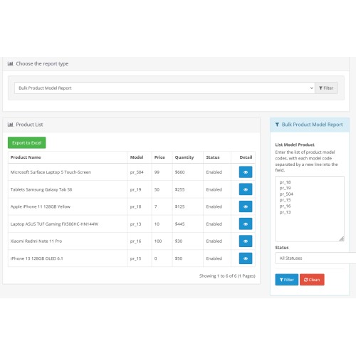 You have a list of product model codes (e.g., MODEL123, MODEL456, MODEL789) or product SKU codes (e.g., SKU123, SKU456, SKU789) and need to extract detailed information about these products from your Opencart system. Instead of manually entering each product code to extract information, this module will help you quickly extract product information by entering product codes in bulk. Key features: