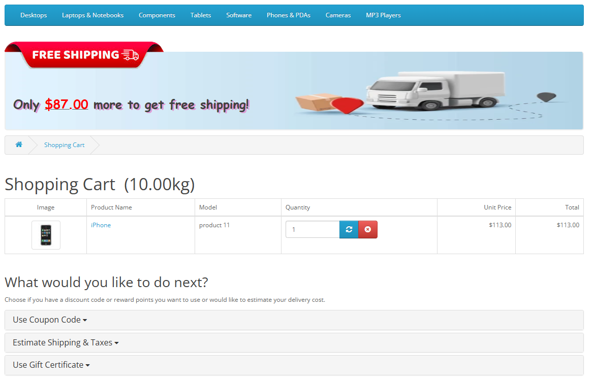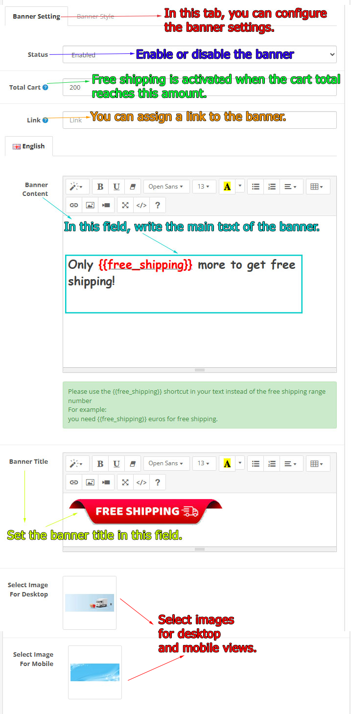 * Customizable banner text using the {{free_shipping}} shortcut.