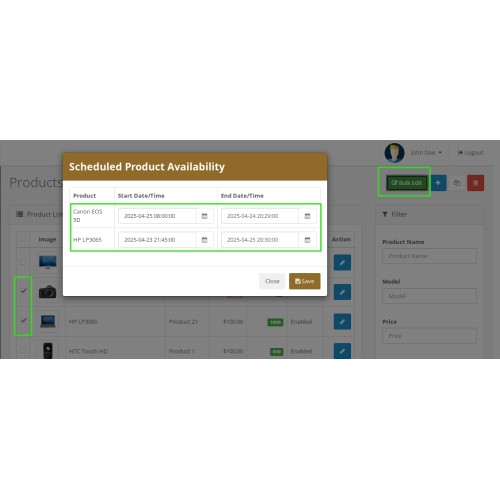 Product gets enabled/disabled based on your schedule * Bulk Schedule via Admin Panel: