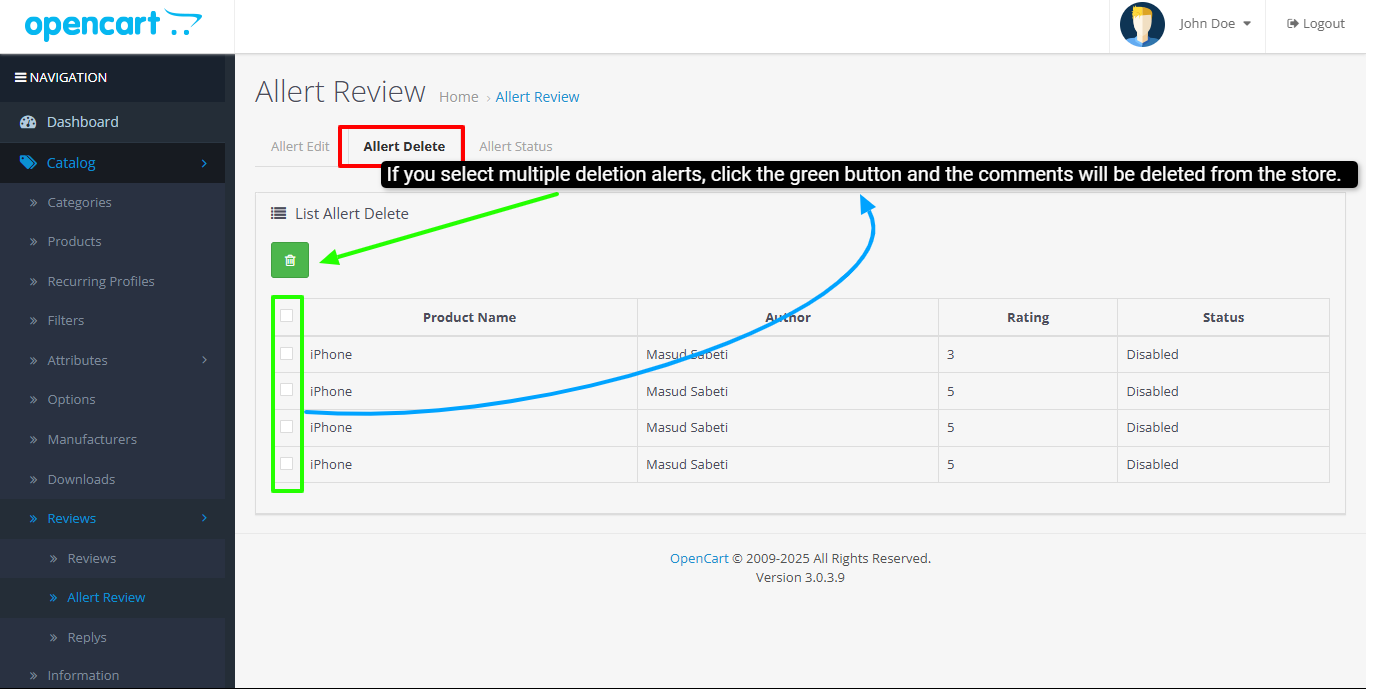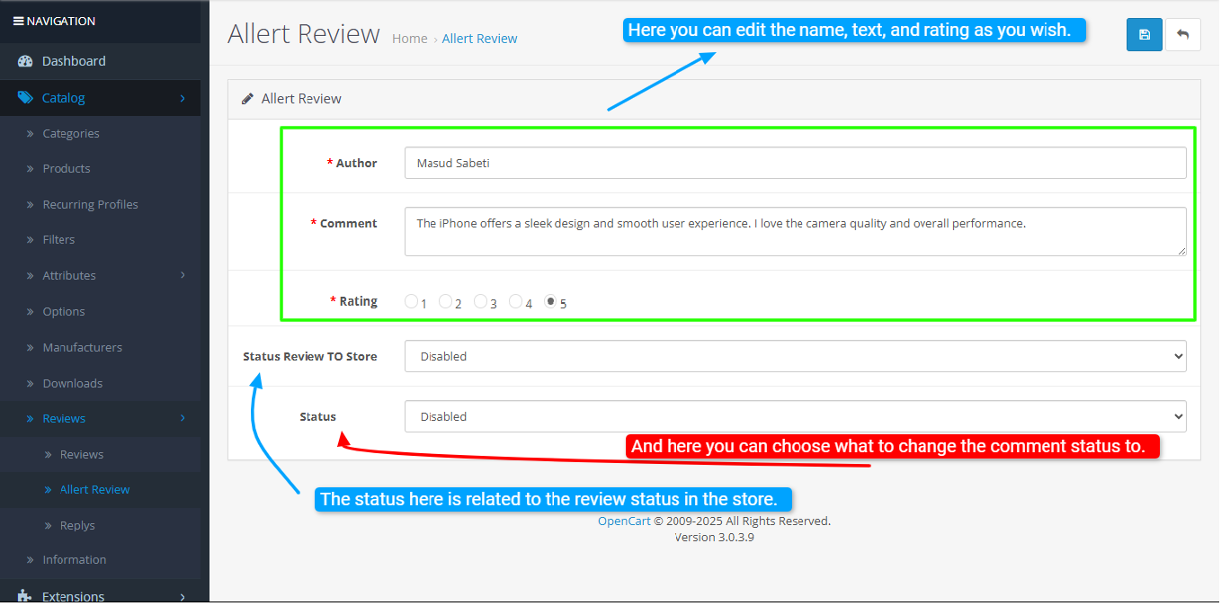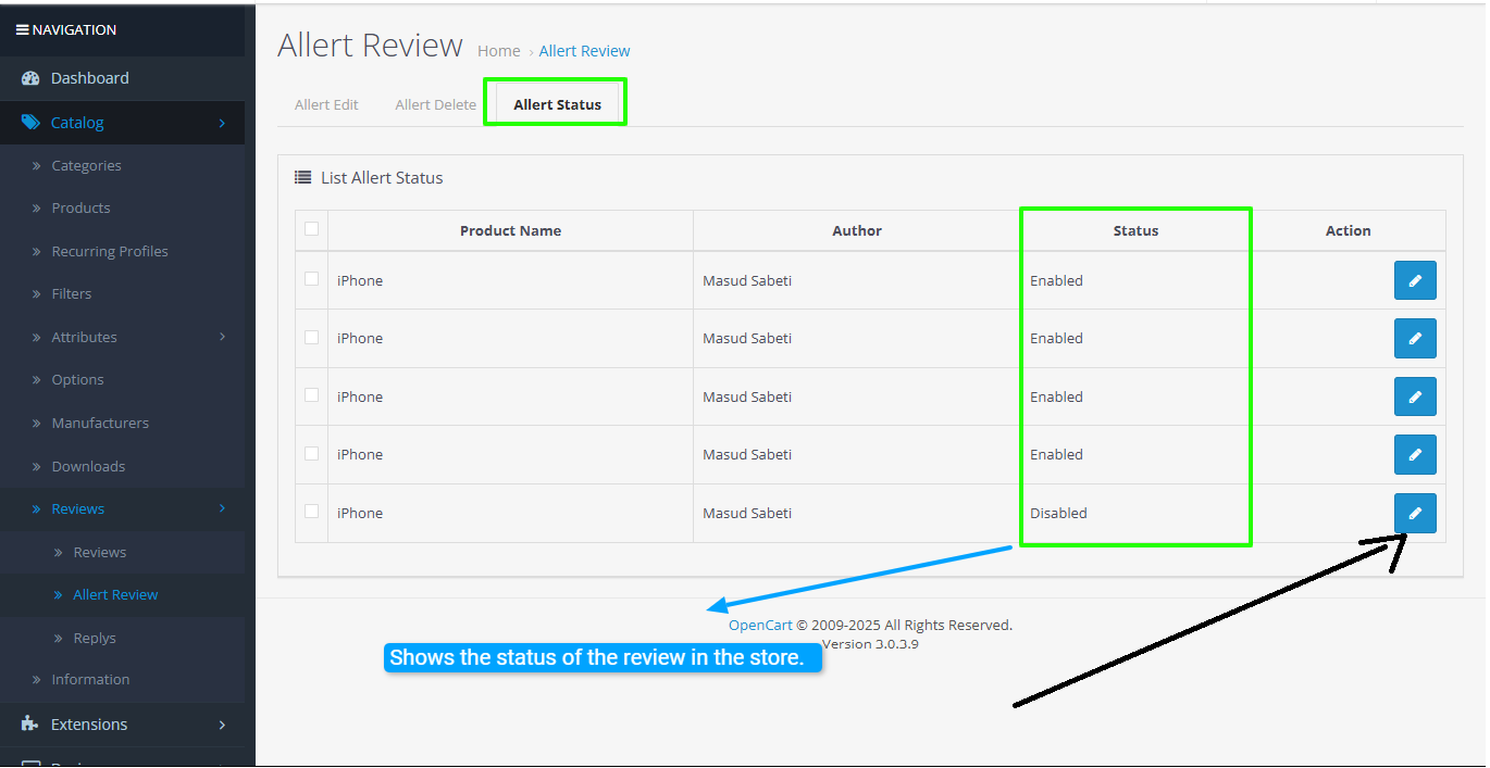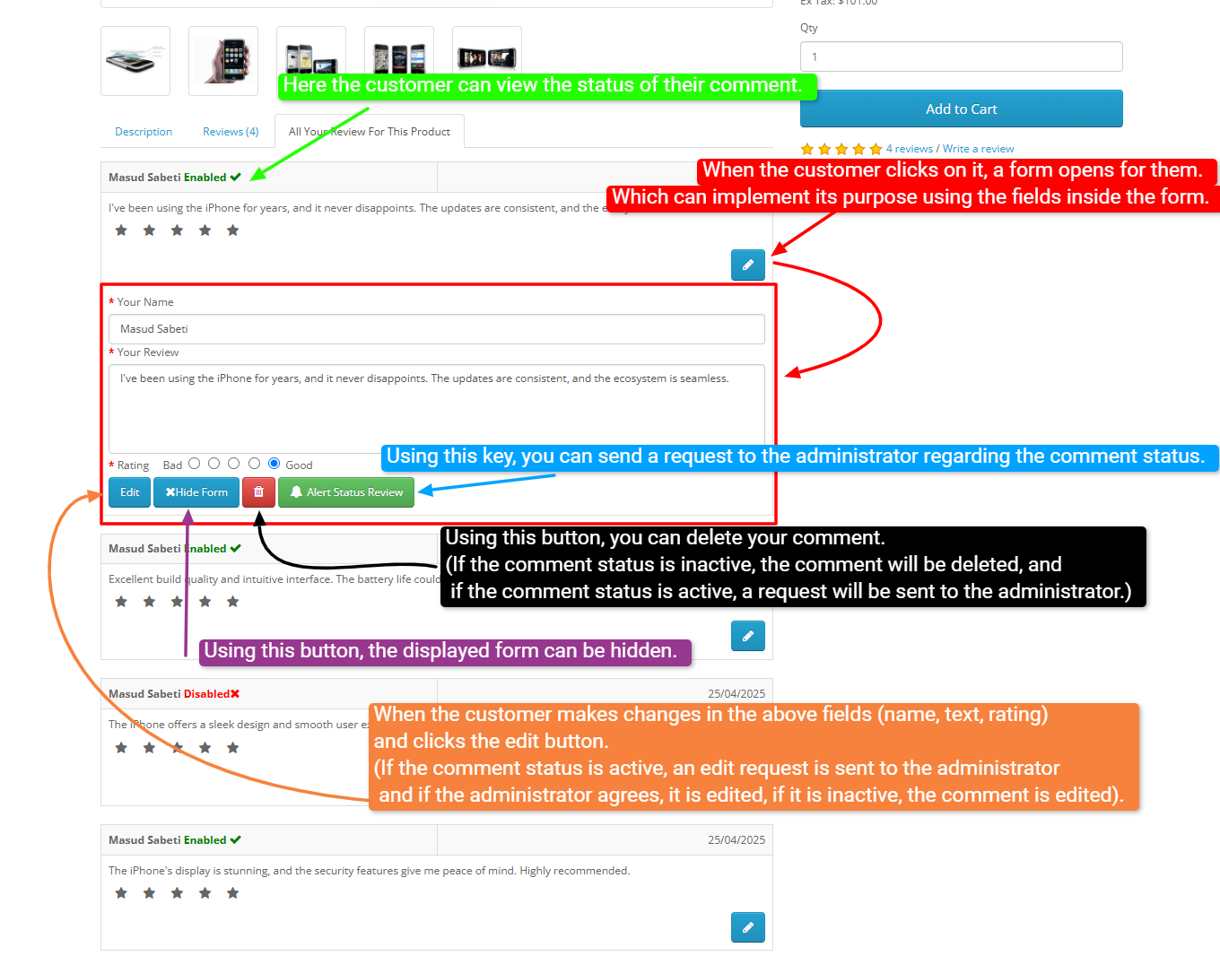 Using this module, you can view the reviews that each customer has left for a product on the same product page in the "All Your Review For This Product" tab (edit, delete, status alert, for example "A customer wants to request the administrator to change the status of his review that is inactive to active and vice versa.").