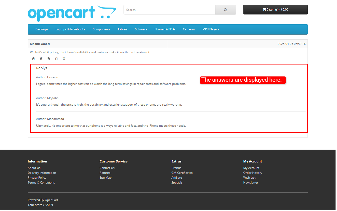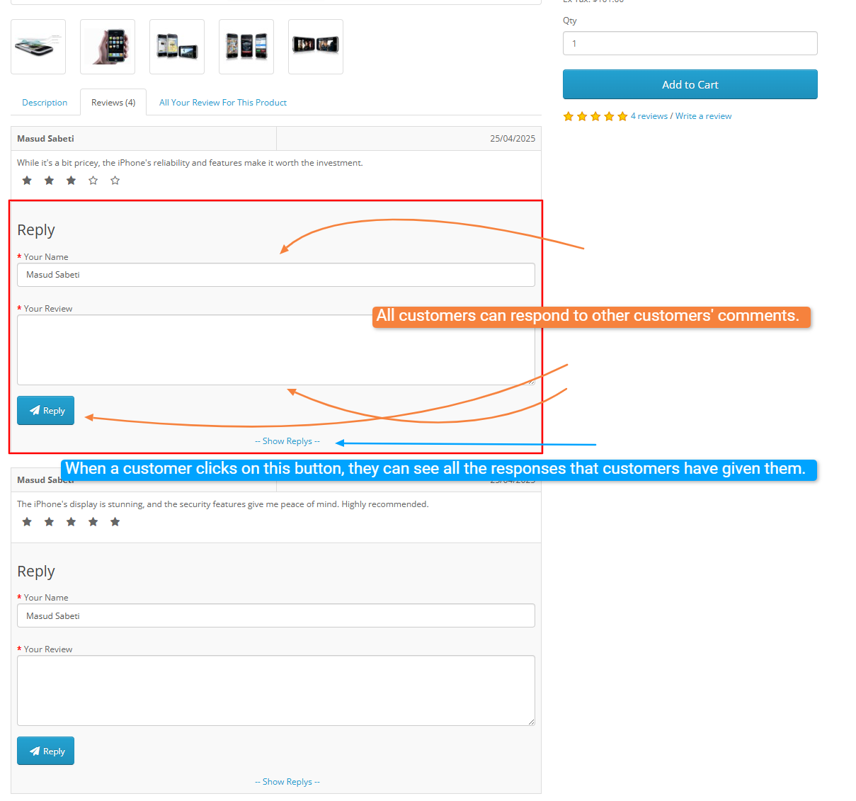 Customers can reply to each other's comments and see them on a replies page. (Of course, the reply that is posted must be activated by the administrator in the status management panel.)