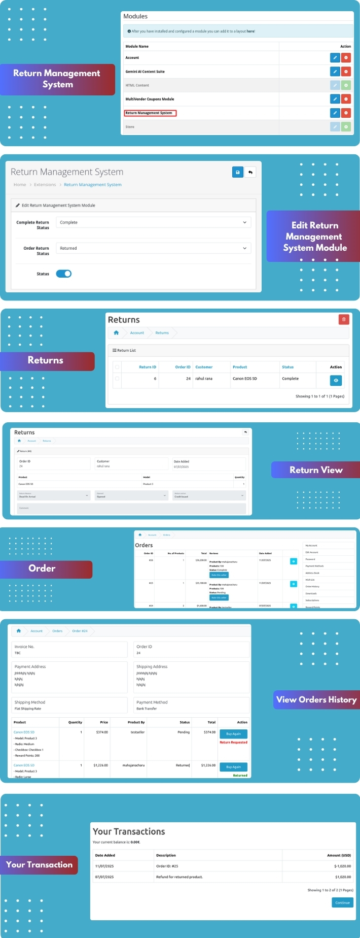 The Multivendor Return Management System for OpenCart is a powerful extension designed to streamline and simplify the return process in a multi-seller marketplace. With this module, customers can easily request product returns, refunds, or exchanges directly from their account, while vendors manage these requests from their dedicated seller panel.