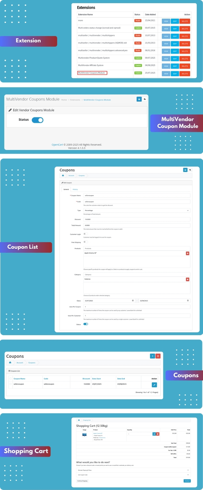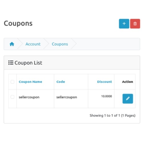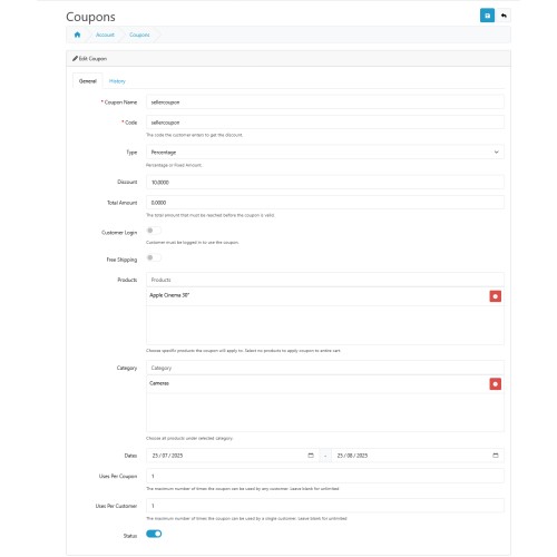 The MultiVendor Coupons Module for OpenCart empowers marketplace vendors to create and manage their own discount coupons directly from their seller dashboard. Each vendor can issue unique coupon codes for their products, set usage limits, define minimum order values, and schedule start/end dates for promotions.