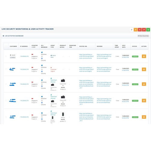 Live Activity Feed: See every customer action, bot visit, and security event as it happens, with instant filtering by category.