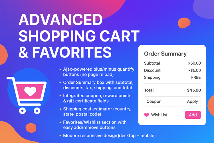 With real-time Ajax updates, a clear order summary, and additional features like favorites/wishlist, coupons, and shipping estimates, your customers can manage their cart more easily and checkout faster