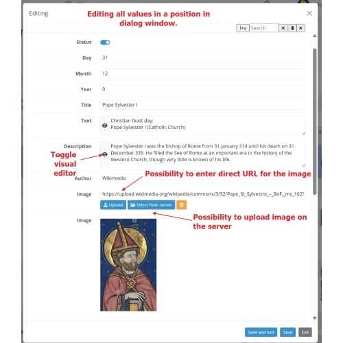 Each value can be edited in separate dialog box. Visual editor is supported. You can use keywords in the text: {year}, {month}, {day}.