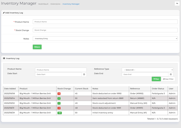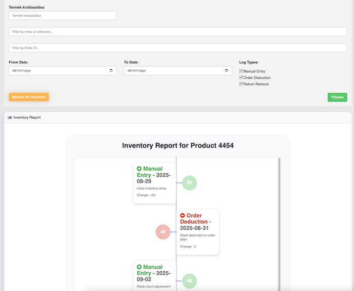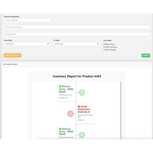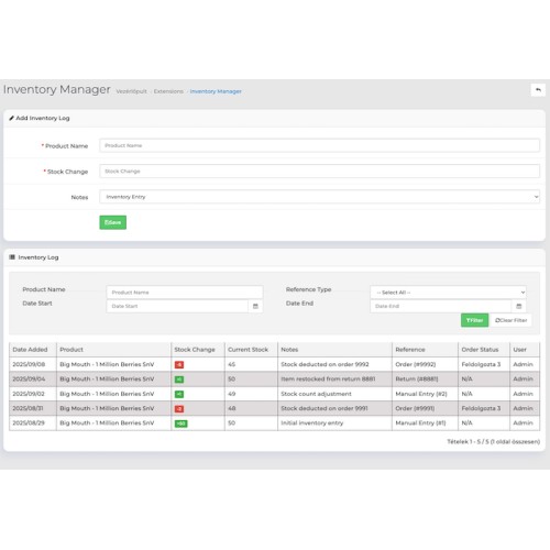 Comprehensive Inventory Log: Every single stock change—whether from an order, return, or manual entry—is recorded in a detailed, searchable log. You can filter the log by product, date range, and reference type to find what you're looking for quickly.