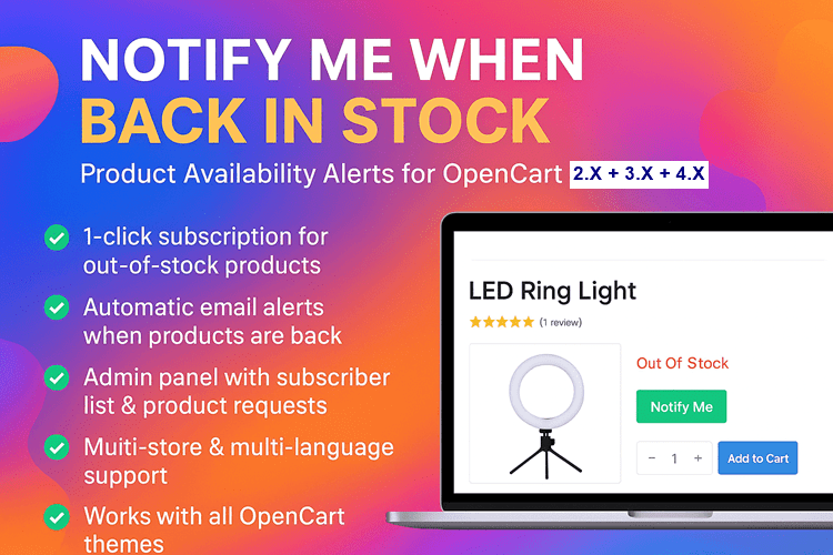Increase sales and keep customers happy! Allow shoppers to subscribe for product stock alerts, and automatically notify them via email when an out-of-stock product becomes available again. Supports OpenCart 2.X + 3.x + 4.x