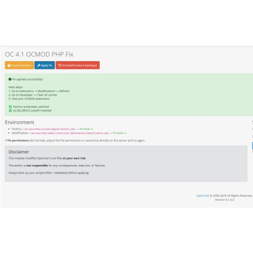A small service module for OpenCart **4.1.x** that restores OCMOD extensions functionality on certain PHP/OS builds.