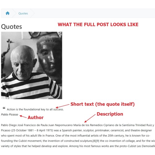 Enter Quotes. Short text to show in block, and description (more text), to show in full post view.