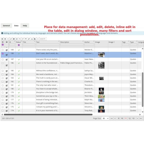 Data management: add, edit, delete, inline edit in the table, edit in dialog window, many filters and sort possibilities.