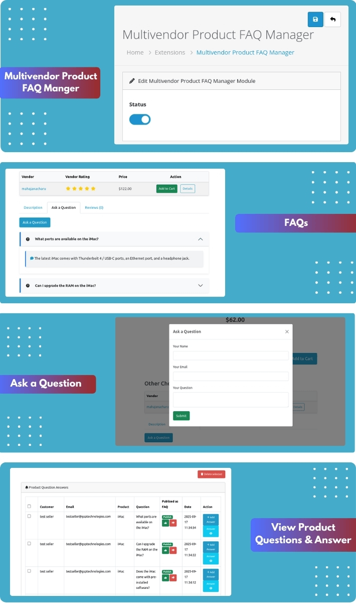 Multivendor Product FAQ Manager allows vendors in your OpenCart marketplace to add, edit, and manage FAQs or customer questions for their own products. Customers can submit questions directly on the product page, and vendors can reply from their dashboard. Admins retain full control with moderation options.