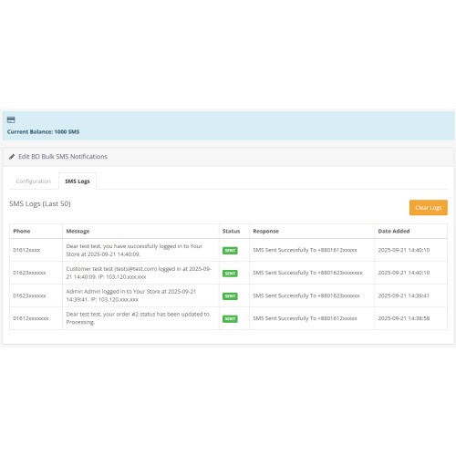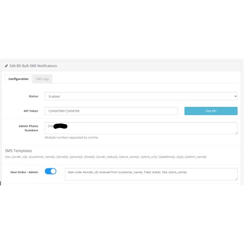 Configure API token, admin contact numbers, enable/disable event toggles, edit templates, and clear logs — all inside the OpenCart admin.