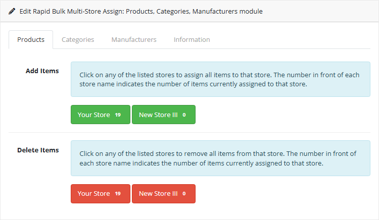 OpenCart extension that enables one-click bulk operations to add or remove all products, categories, manufacturers, and information pages across multiple stores. Perfect for quickly provisioning new stores or rebalancing existing ones without manual per-item edits.