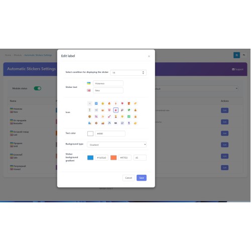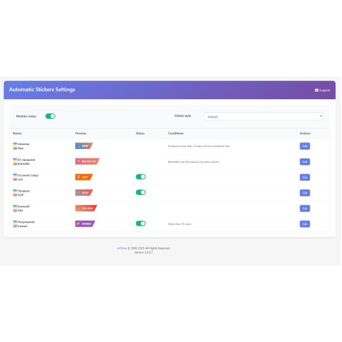 The extension automatically adds stickers on the product page, within Categories, Manufacturers, Specials and Search, as well as in modules Featured, Bestsellers, Specials and Latest. Works via OCMOD — no core files are modified. Supports style presets, emoji/icons, and multilingual texts with full color control.
