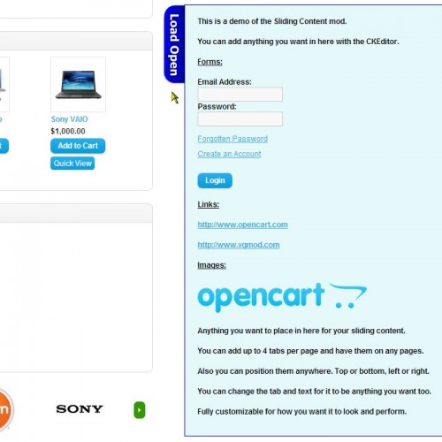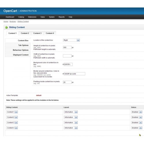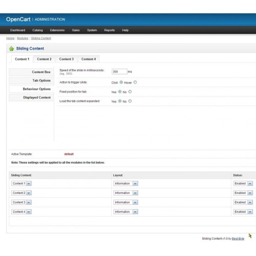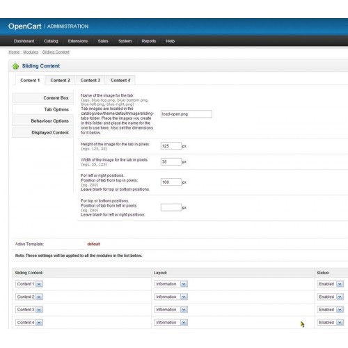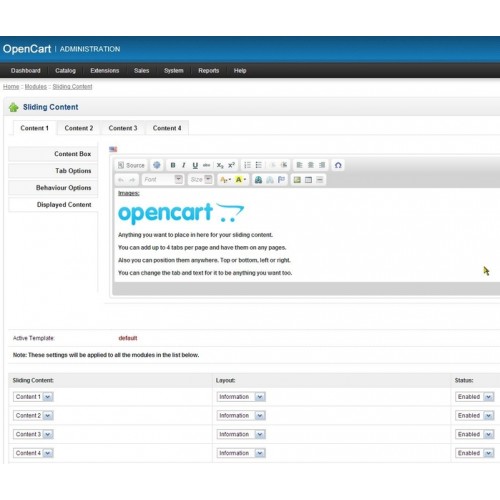 This extension lets you add sliding content tabs that you add your own content to that you want displayed with the CKEditor and choose the tab you want displayed for it. You can add up to 4 sliding content tabs per page and have them on any pages and positions you want. Included are tabs in 8 different colors for all positions. Just edit them and add your own text you want for the tabs. You can also create and use your own tabs too. Fully customizable with many options to choose located in the admin.