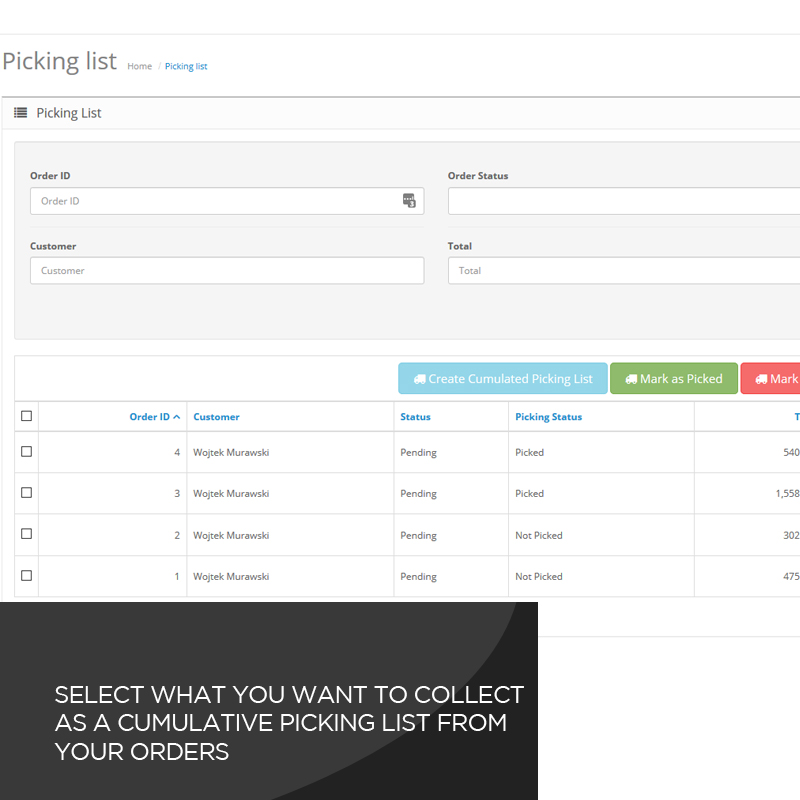 Select Orders for accumulated picking. This can be across Multiple orders with Multiple Products.