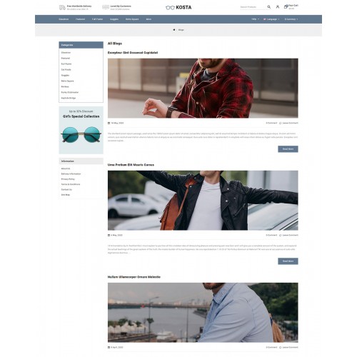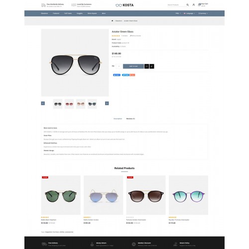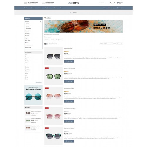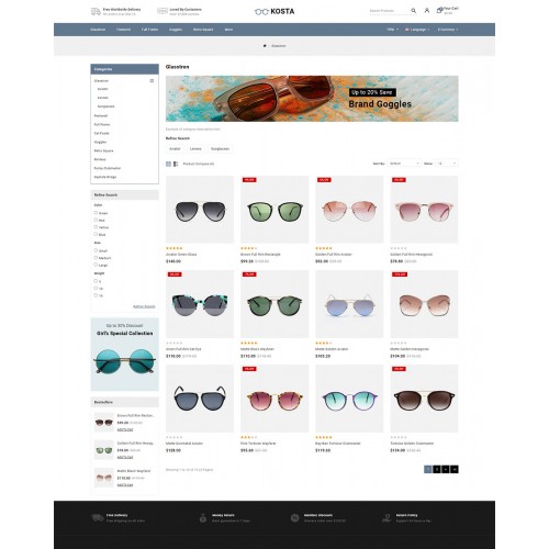Kosta Goggles Store opencart responsive theme perfect design for sale fancy goggles and frames for men, women and child. Actually theme looks perfect to sale any types of product because of large size product images and full width layout. Moreover design layout of this theme is unique and colors also suitable for any types of eCommerce store.